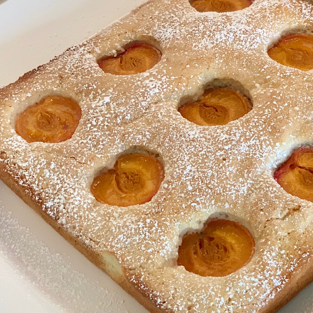 With a haul of fresh apricots from a local farm stand, I set about finding ways to use them and enjoy the fresh sweet-tart flavor. Today, I settled on an Apricot Almond Cake, the bonus was that I had everything I needed already on hand. I used a recipe, as a base, I found from food52.com, and cut it down to a smaller square pan.